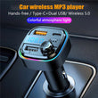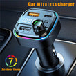 Lenyes Car Charger – A multifunction Type-C + USB fast charger with 8-color LED lighting, FM transmitter, and Bluetooth music playback, designed for smart in-car convenience.